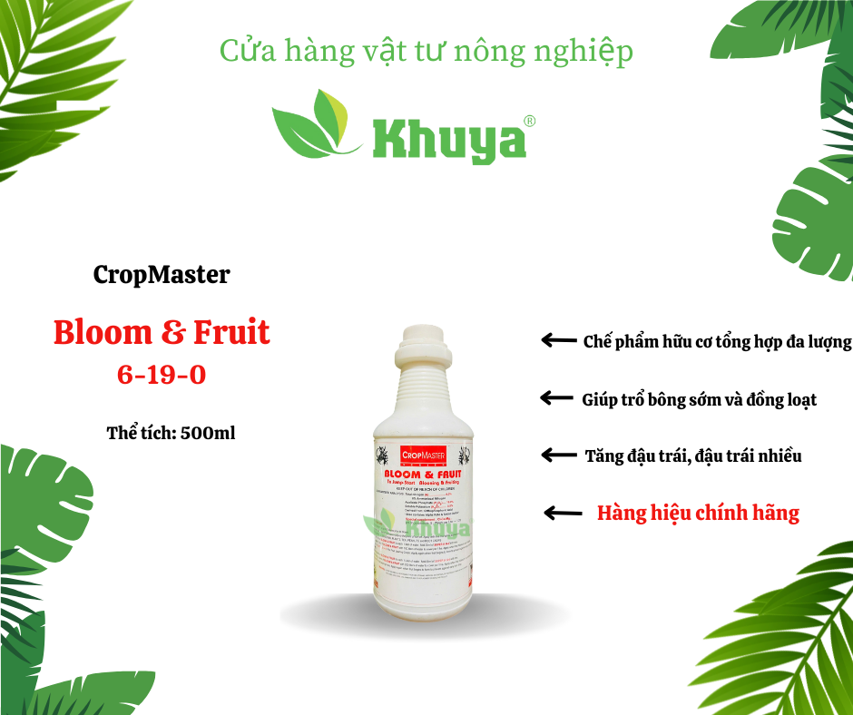 Bloom & Fruit là chế phẩm hữu cơ tổng hợp đa lượng , với lượng Phốt phát hữu cơ cao + chất phụ gia đặc biệt thúc đẩy quá trình trổ bông đồng loạt, trổ bông sớm, đậu nhiều trái.