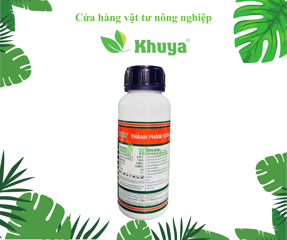 Chât hữu cơ: 5%; Nts: 0,09%; P2O5hh: 0,36%; K2Ohh: 1,44%
