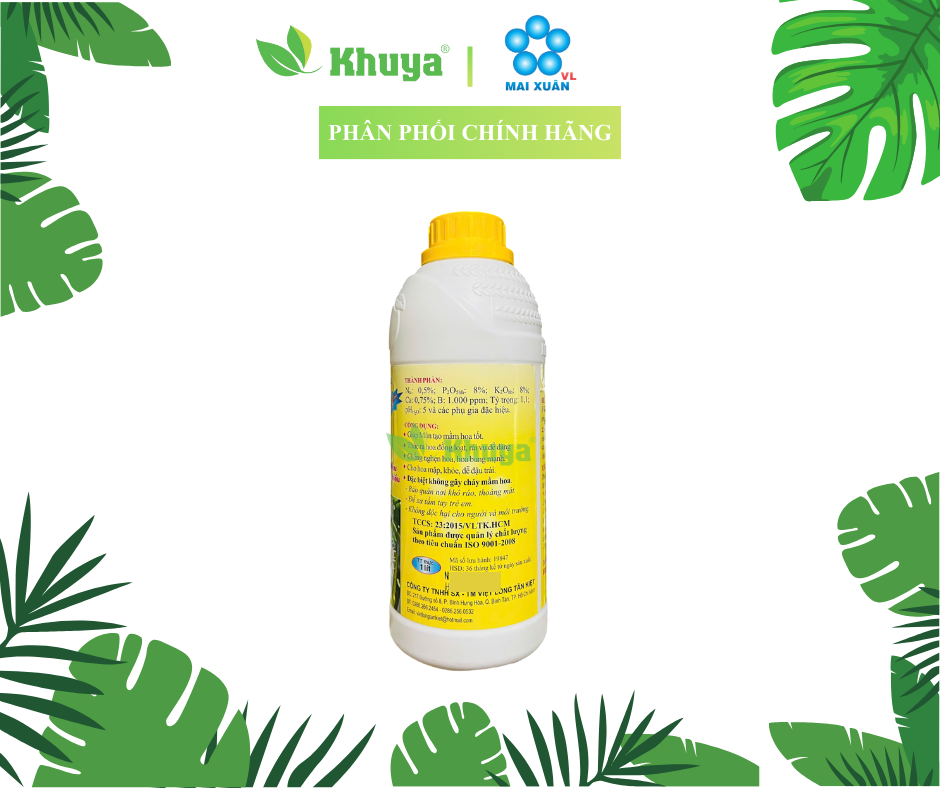 N 0.5%; P2O5 8%; K2O 8%; Ca 0.75%; B 1.000ppm; Tỷ trọng 1.1 và các phụ gia đặc hiệu (Thành phần có thể thay đổi tùy lô sản xuất của công ty, vui lòng liên hệ cửa hàng nếu có nhu cầu biết chính xác tại thời điểm đặt hàng)