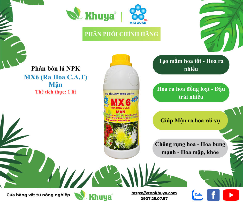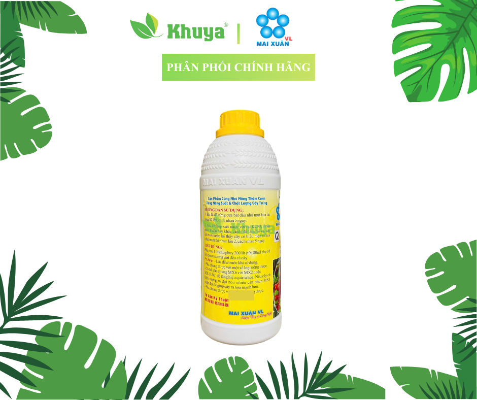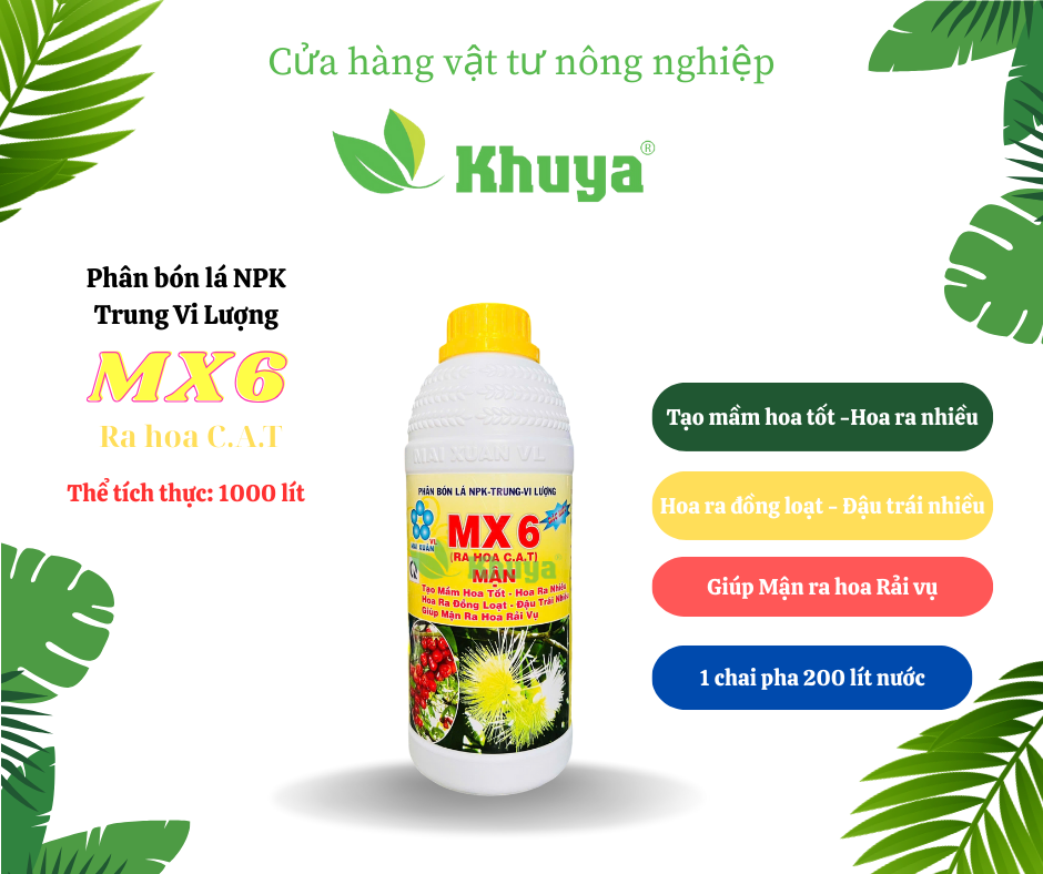 - Có thể pha MX6 với MX2 hoặc MX F.Bo để tăng hiệu quả ra hoa. Nếu cây có hiện tượng ra đọt non nhiều cần phun MX3 chặn đọt để cây ra hoa mạnh hơn