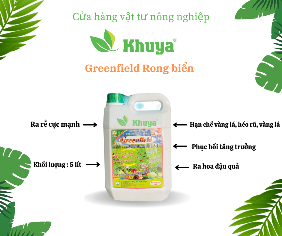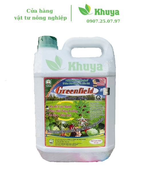 - Greenfield là sản phẩm phân bón tưới gốc được cung cấp đầy đủ N-P-K, trung vi lượng và các chất điều hòa sinh trưởng sinh học được chiết xuất từ Rong Biển thiên nhiên và các chế phẩm sinh học từ thực vật và acid Humic.