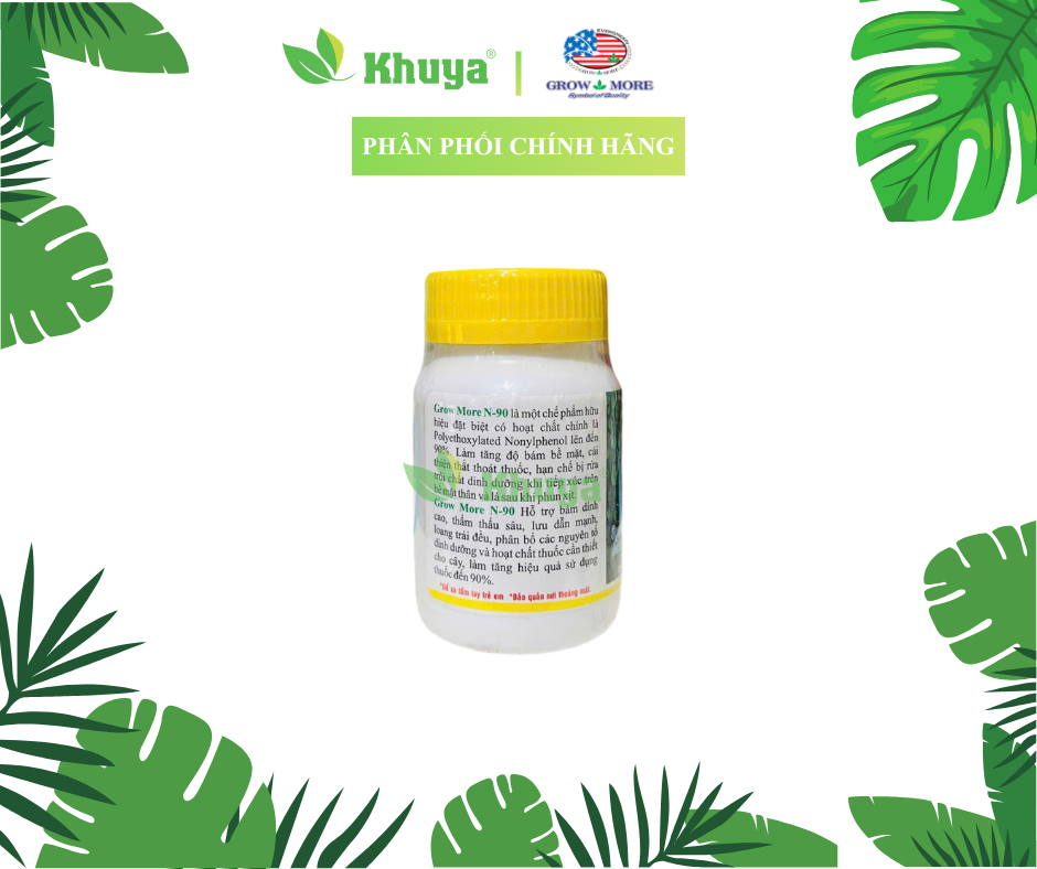 Grow More N-90 là một chế phẩm hữu hiệu đặc biệt được sản xuất bởi cty Grow More Inc U.S.A HOA KỲ, N-90 có hoạt chất chính là Polyethoxylated Nonyohenol lên đến 90%. Làm tăng độ bám bề mặt, cải thiện thất thoát thuốc, hạn chế bị rửa trôi chất dinh dưỡng khi tiếp xúc trên bề mặt thân và lá sau khi phun xịt.
