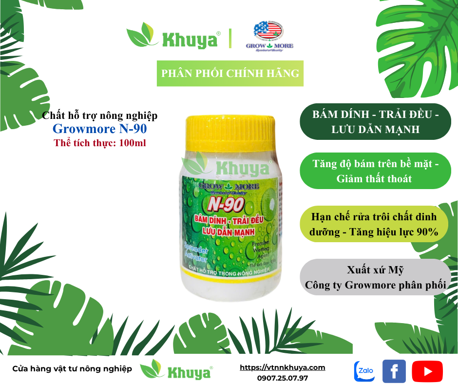 Grow More N-90 hỗ trợ bám dính cao, thấm sâu nhanh, lưu dẫn mạnh, loang trải đều, phân bố đều các nguyên tố dinh dưỡng và hoạt chất th cần thiết cho cây, làm tăng hiệu quả sử dụng th lên đến 90%.