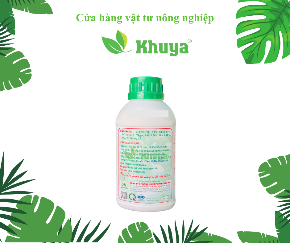 Thành phần: N: 1,5%; P2O5: 1,8%; K2O: 0,63%; Zn: 15ppm; B: 260ppm; Ga: 0,24%; NAA: 0,06%.