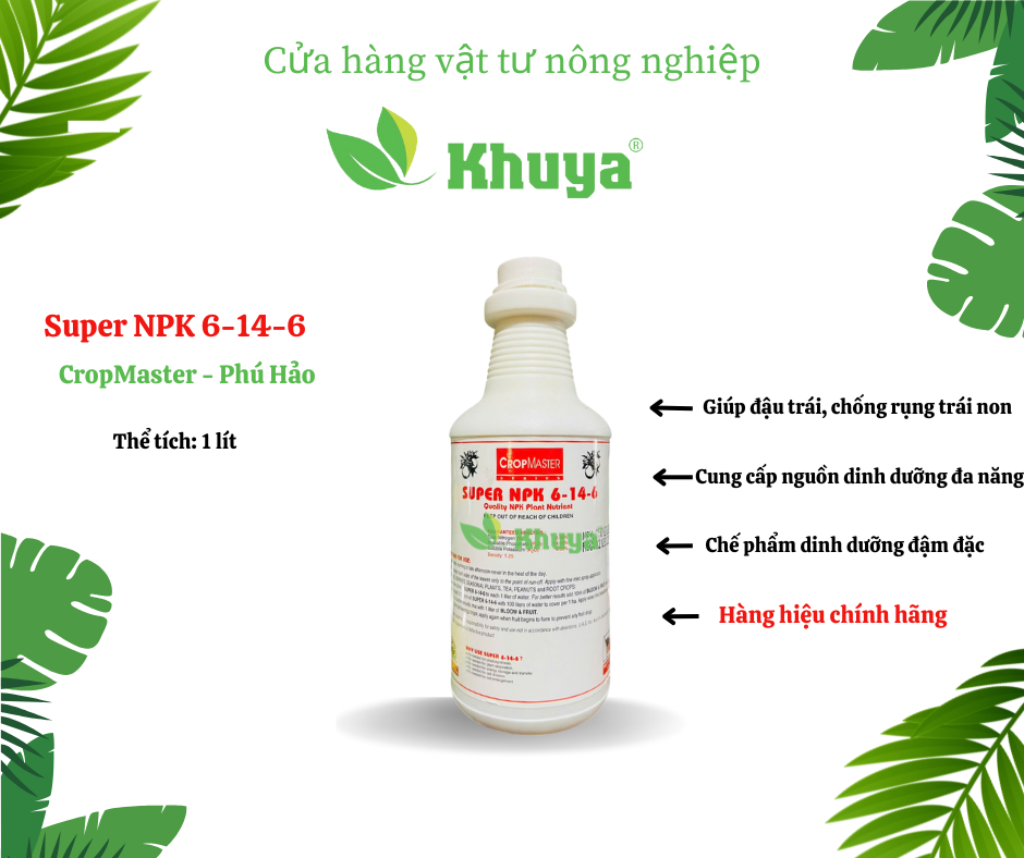 * Công dụng : SUPER 6-14-6 là chế phẩm dinh dưỡng đậm đặc: Đạm cá - Rong biển - Axit mùn - Vi lượng - Vitamin, giúp tăng đậu trái, chống rụng trái non. Cung cấp nguồn dinh dưỡng đa năng.