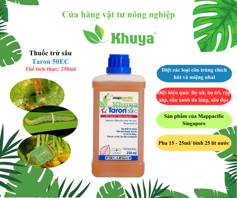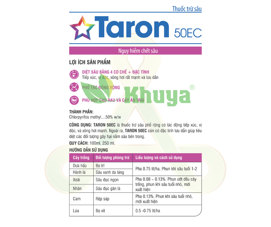 Taron 50ec diệt sâu bằng 4 cơ chế ; tiếp xúc , vị độc , lưu dẫn và xông hơi rất mạnh. Phổ tác động hiệu quả cao với sâu hại như; bọ trĩ hại Dưa, sâu xanh da láng hại Hành, rệp sáp hại Cam Bưởi, Sâu đục ngọn hại Xoài và Đào, sâu đục gân lá Nhãn, Bọ Xít hại Lúa ....